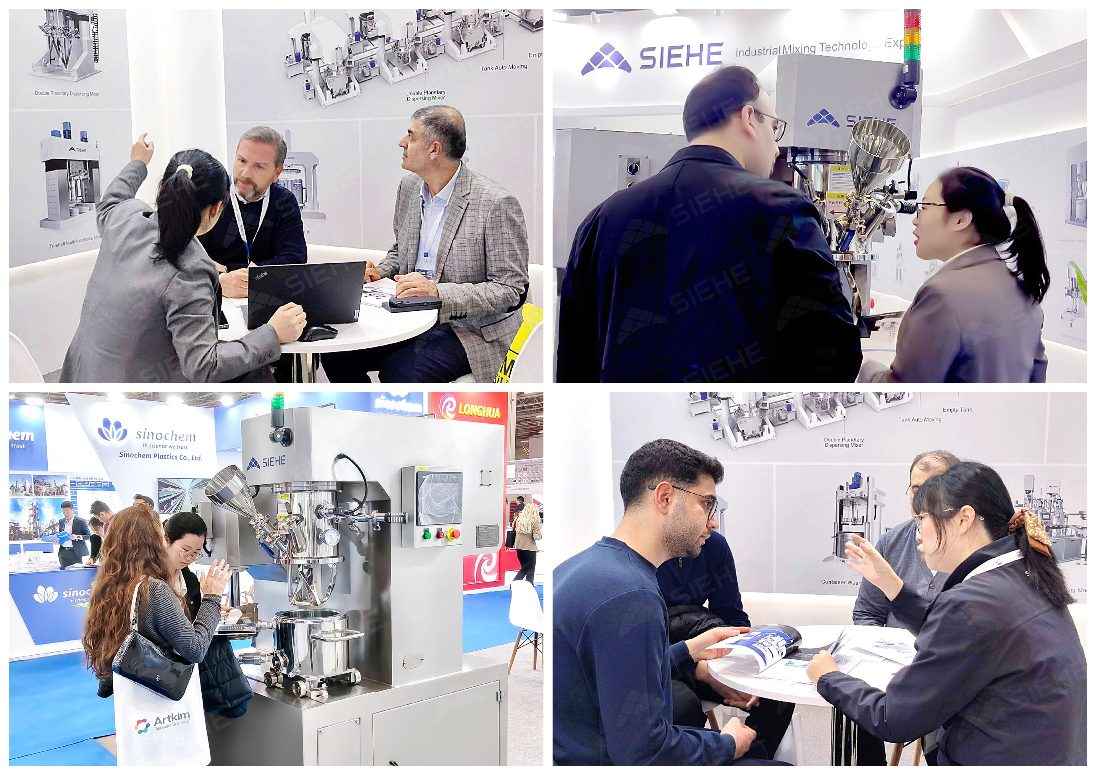 展会期间,世赫集中展示了全自动胶粘剂成套生产线、胶粘剂/密封胶生产系统、双行星分散搅拌机、立式真空干燥系统、硬管全自动灌装机等核心设备,直击行业生产痛点,成为现场焦点之一。其中,全自动胶粘剂成套生产线集成自动配料、搅拌、压料、清洗及拉缸自动行走系统,依托先进的HMI智能控制系统,实现生产环节全自动化,显著提升产品一致性并降低能耗。世赫明星产品双行星分散搅拌机,最高处理粘度可达10,000Pa.s,其麻花式桨叶精密铸造,经CNC中心加工,对高粘度物料具备极佳的捏合力、均匀度和搅拌效率;配合特殊设计的双层强力高速分散器,显著提升混合分散效率。立式真空干燥系统,集拆包投料、混合干燥与智能控制等功能于一体,核心设备为立式螺带干燥机,特殊螺带设计使物料充分翻转,同时与容器壁保持极小间隙,减少物料粘连;主轴采用双端面机械密封,连接真空系统后进行高效干燥,效率较传统设备提升3-5倍。
