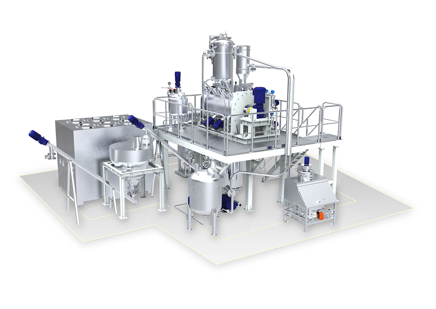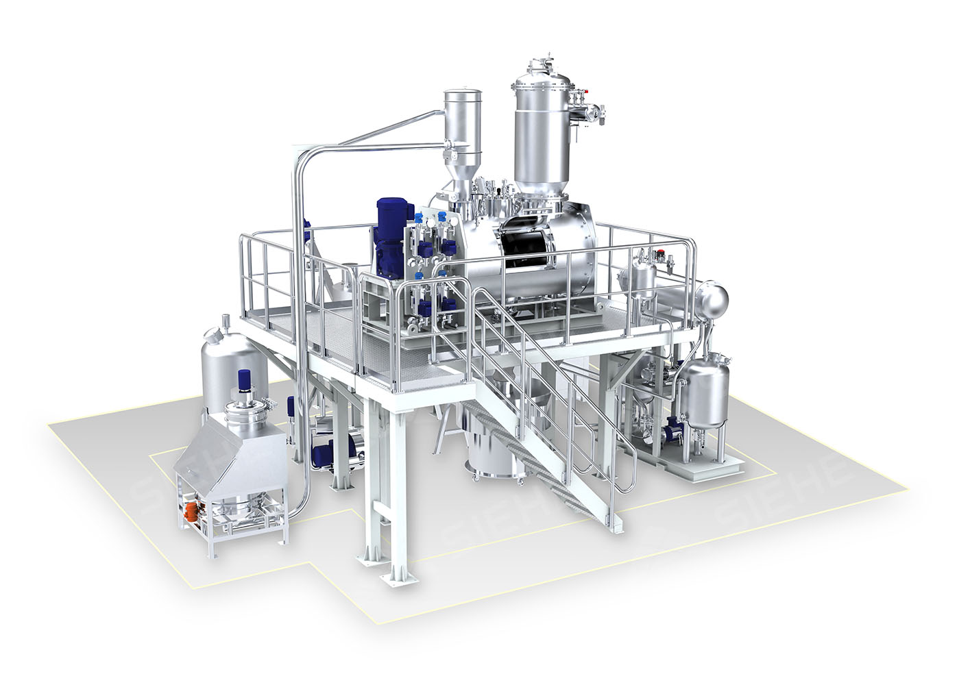 本次交付的卧式犁刀真空干燥系统,涵盖粉体拆包与输送、液体自动配料、混合干燥、智能控制、CIP清洗及温控配套机组等多个核心单元,以紧凑布局实现高效、洁净、稳定的工艺流程。