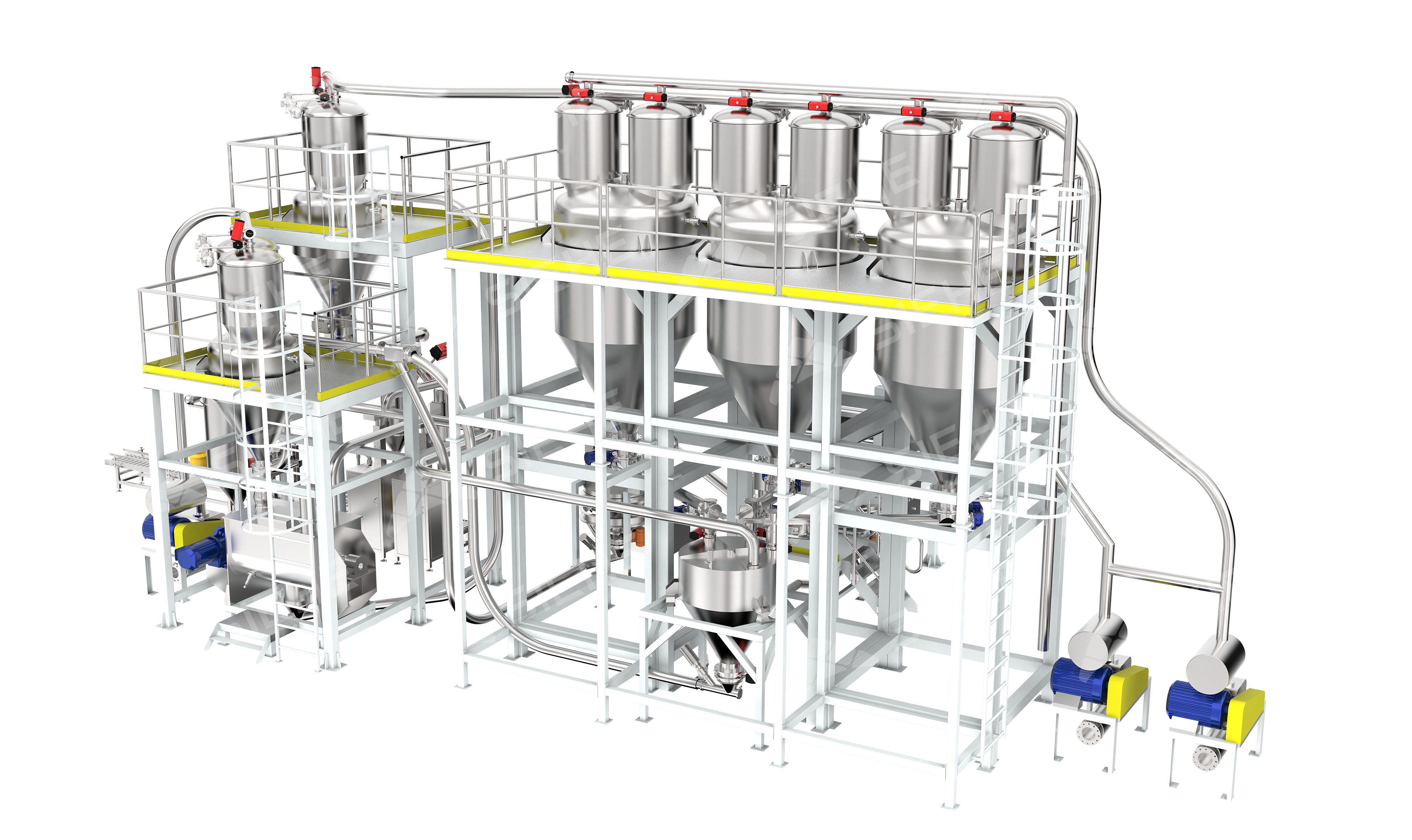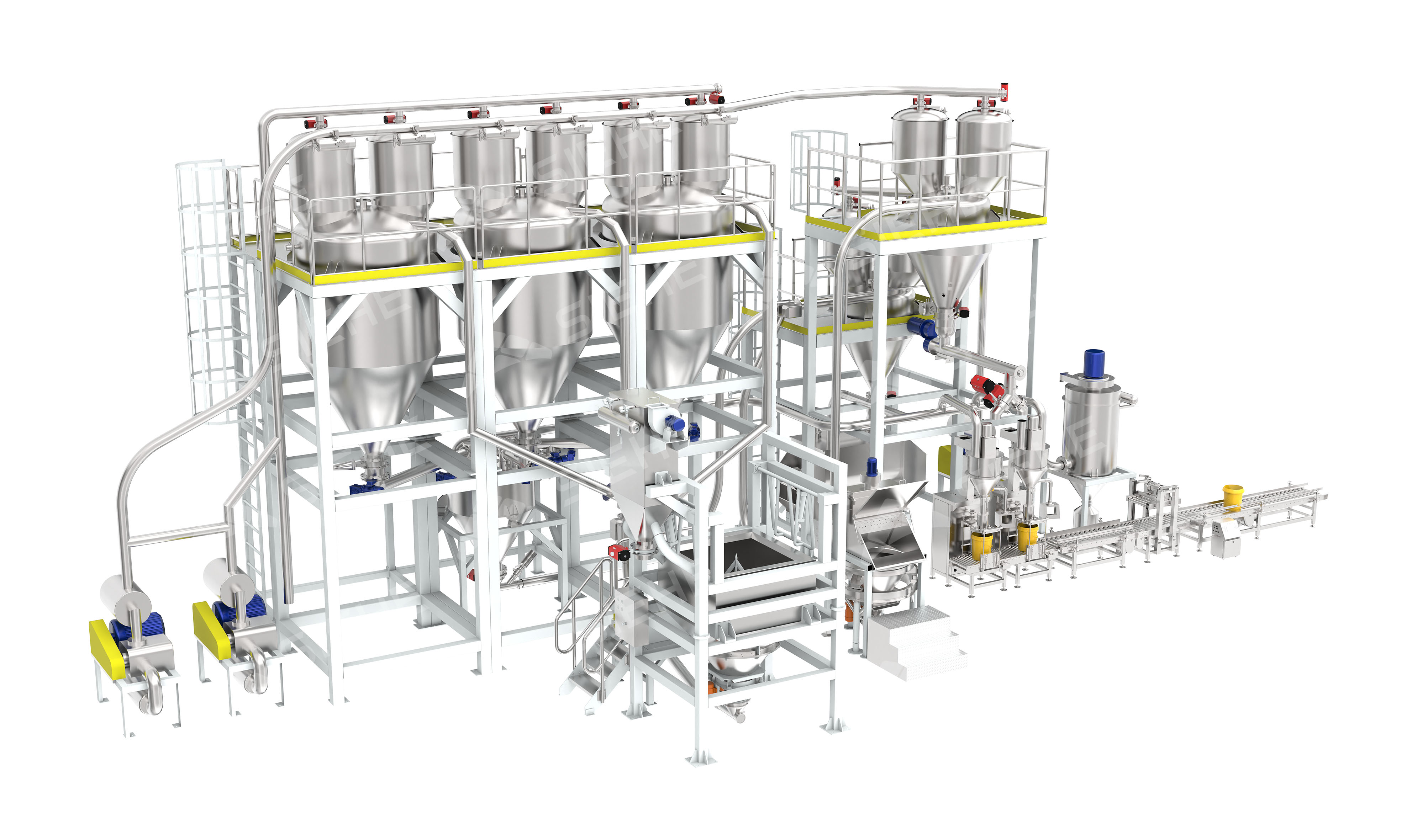 大袋粉体原料采用负压稀相输送方式,撬块式设计原料储存和全自动配料系统,全程密闭输送,保障生产环境洁净。针对客户厂房高度限制,设备总高需低于8米,创新采用气粉分离与储料仓一体式结构,有效控制撬块高度,并采取连续进料设计,保障产能。储料仓配置雷达料位计和固定式料位计,双重安全保障、实时监控料位。系统采用伺服控制及梅特勒-托利多高精度模块,可自行按单号、配方执行自动配料,精度可达5‰。配料完成后气力输送至缓冲仓等待混合。